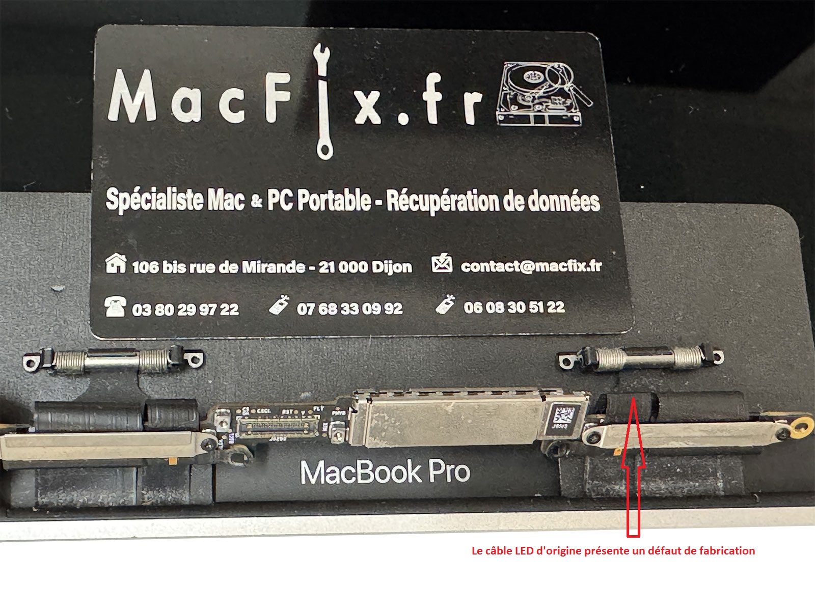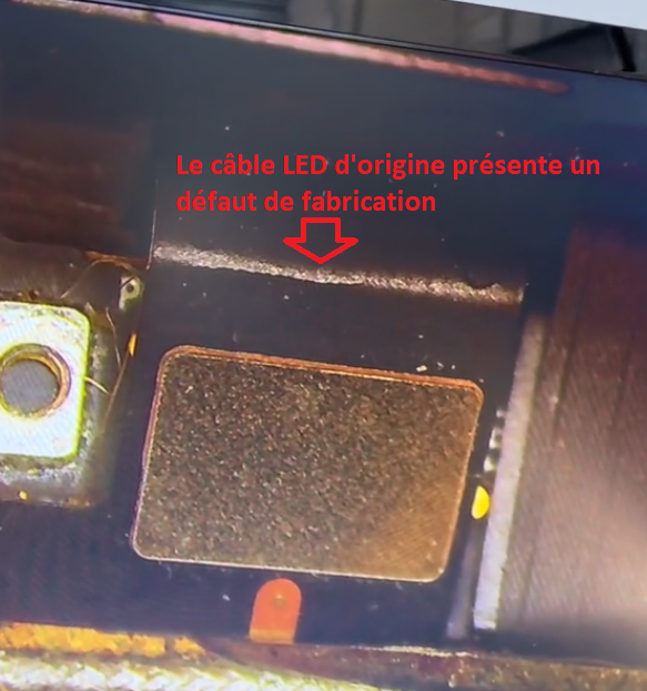 Le câble de rétroéclairage LCD d'origine étant trop court, une utilisation fréquente (ouverture et fermeture répétées de l’écran) entraîne une flexion excessive des câbles, ce qui provoque leur usure. Cela peut résulter en un dysfonctionnement partiel du rétroéclairage, voire un écran totalement noir lorsque l’angle d’inclinaison devient critique.